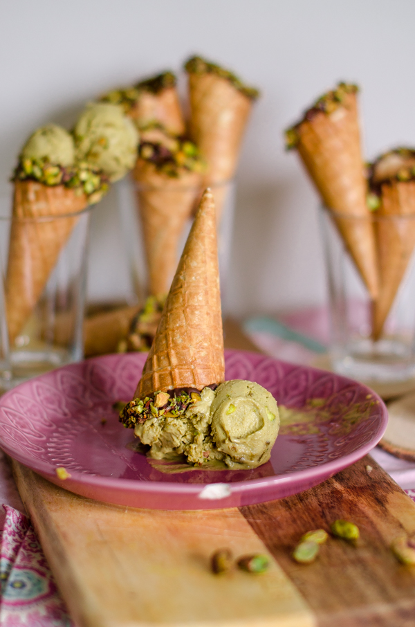 Pour half of the batter in a container, then add 2 tablespoons pistachio butter on top. Pour remaining batter and top with another 2 tablespoons butter and rest of the pistachios. Put to the freezer for good couple of hours but the best for overnight. Next day take out ice creams out of the freezer, wait 5-10 minutes until they soften a bit and then serve in the cones.