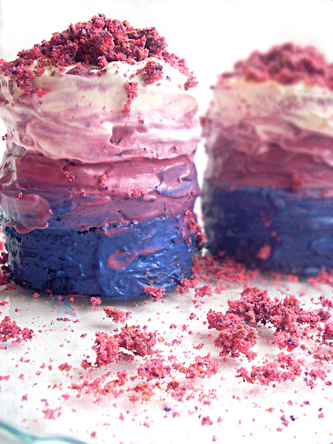 Biszkopt zrobił mi niesamowicie cudowną niespodziankę. Miał być fioletowy, więc kiedy wmieszałam do masy fioletowy barwnik i stwierdziłam, że to nie jest kolor, który mnie satysfakcjonuję, postanowiłam dodać trochę granatowego barwnika, żeby go przyciemnić. I owszem cały biszkopt nieco przyciemniłam, ale poza tym po upieczeniu okazało się, że biszkopt jest cudownie dwukolorowy- zwykły zbieg okoliczności, ale chcielibyście zobaczyć moją minę, kiedy wykroiłam pierwsze kółko i zobaczyłam ten niejednolity kolor; ) Barwniki w proszku czynią cuda: )