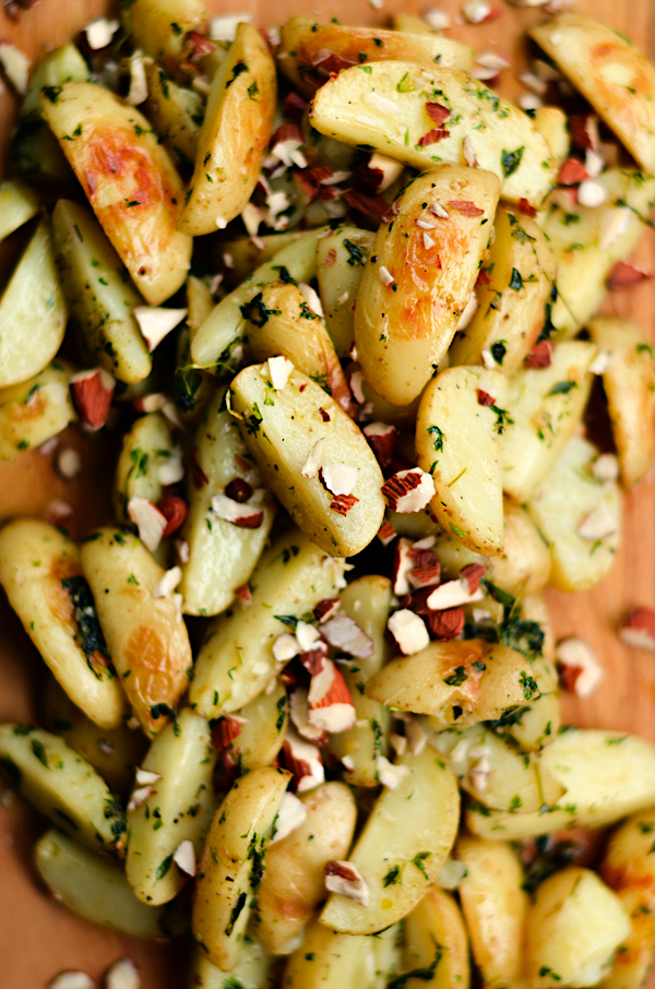 When potatoes are tender, pour herb butter on top of the potatoes and stir everything, take back to the oven and bake 5 minutes more. Take out from the oven and let cool a bit. Sprinkle with chopped almonds and serve.