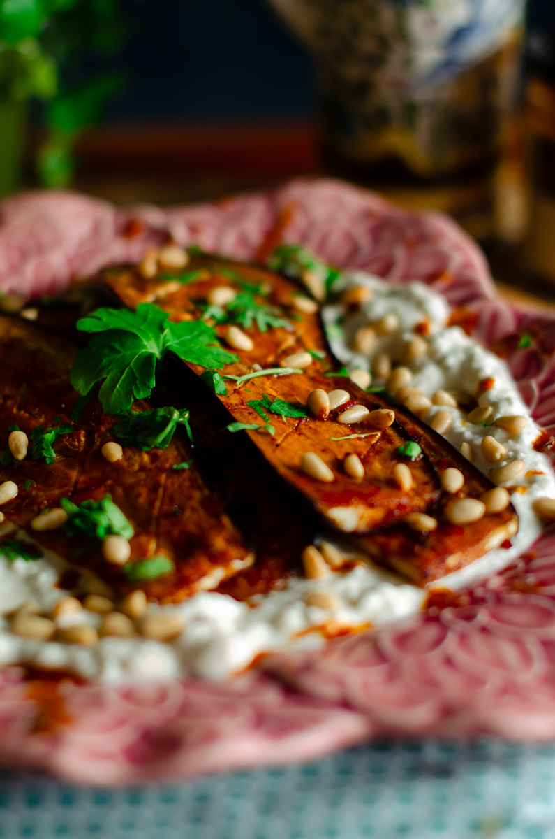Baked harissa aubergine with yogurt feta, for English scroll down